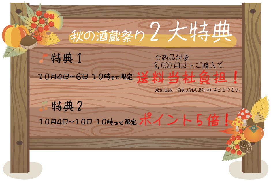 今年もはじまりました。出張!秋の酒蔵まつり。早めのご注文がとってもお得!!!8,000円以上のお買い上げで送料当社負担、ポイント5倍!もちろんお祭りの顔、大人気のあの一升瓶や6本になって復活したお得なセットもご用意しております!!数量限定の特別企画ですので、ぜひこの機会をお見逃しなく。 お買い忘れのないよう、どうぞ 秋の酒蔵まつりを心ゆくまでお楽しみくださいませ!